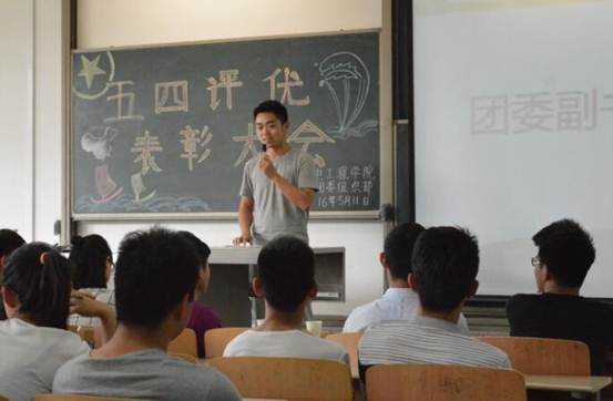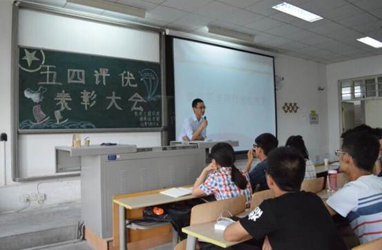 “五四”表彰大会在教2-402举行。出席大会的嘉宾有14级导员黄彦军老师、团委副书记胡俊杰、秘书长张晨以及团委学生会各部门的部长。