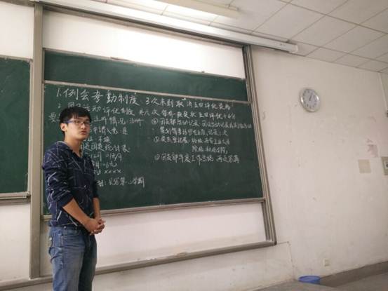 会议上,主持人先向班委介绍了自己和团委副书记。紧接着,他详尽地讲解《团支部工作记录本》的填写要领,并说明《团日活动策划书》的书写注意事项。此过程中,台下人员亦仔细聆听学习,认真地记下了笔记。最后,团委副书记胡俊杰讲话,其中强调了班委工作职责,再次解说团日活动的策划、总结与通讯稿的编写事项。