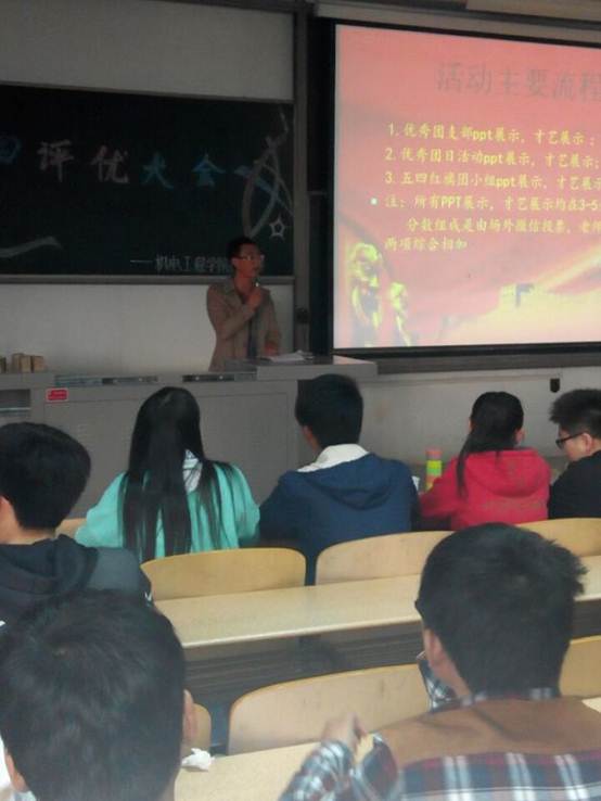 本次评优大会主要是通过主题答辩和风采展示的形式:评选出五四红旗团支部5个、五四红旗团小组10个、优秀团日活动5个。在同学们的热烈掌声中,黄彦军老师做了致辞,对各位部长们的尽职尽责表示了积极的肯定,对团组织的团聚上进也表示了高度的赞扬,同时,黄老师要求同学们本着公平、公正的原则,筛选出在成人导航