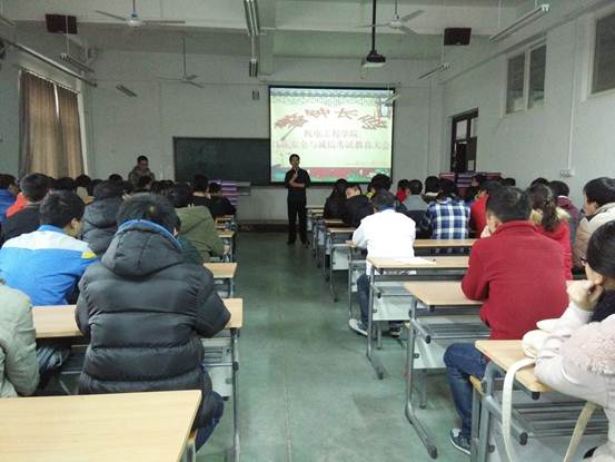 会议伊始,张晖老师对大学生的人身安全作了特别强调,提醒同学们临近放假,要注意自己的财产安全和人身安全,离开宿舍时关好门窗,切断所有电源,顺利回家。接着,张老师通过发生在身边的实际事例和上海外滩踩踏事件,进一步向同学们阐述了安全的重要性,嘱咐同学们要树立安全防范意识。最后,黄彦军老师要求同学们诚信考试,叮嘱大家在接下来的几天时间里认真复习,并对违纪考试的相关处分作了说明。