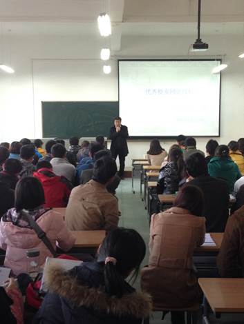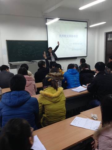 工作。他从自身的学习以及对自己职业规划方面告知在校学生:“方向要明确,准备要提前,行动要扎实”,并着重强调了要执行好落实好工作,少抱怨,并结合工作情况讲了在校担任干部对工作的帮助。千登是050213班班长,09年考取长安大学研究生,现在067基地工作,他着重为大学毕业后有意考研深造的同学做了自身考研经验的交流,为大家提供了一些他亲历的更为快捷有效的考验复习方法。潘创,09年毕业,曾是学生会主席,现在高新公司上班。他在毕业后就考虑好了自己职业的发展方向,目前已在一些企业的多个职务任职,很懂得抓住机会,也时刻清晰自己以后的发展方向。他总结说,在大学生活中仅剩不多的时光中,要着重内修;对于生活,要以积极的心态去接受任何人,因为凡存在必有其存在的价值。三位学长依次进行了精彩的发言并与同学们交流互动,达到了很好的效果。