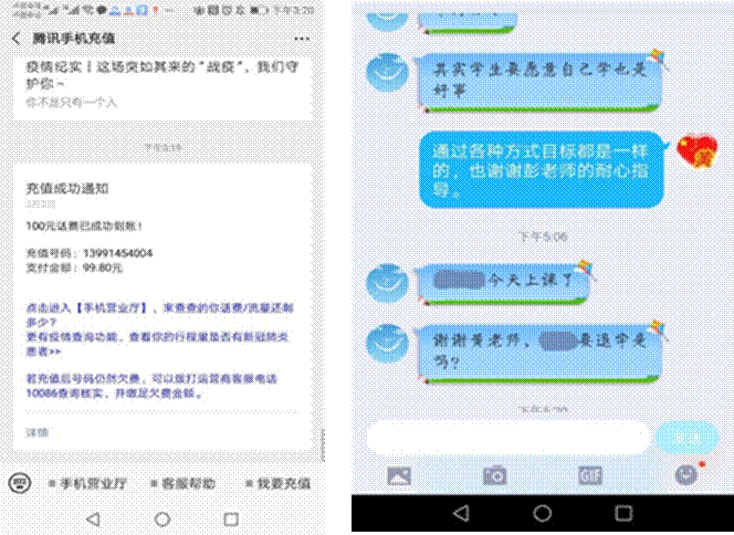 图为2018级辅导员黄彦军老师为保证学生顺利上课的话费充值记录及课后跟踪学生上课情况与任课老师的对话记录。