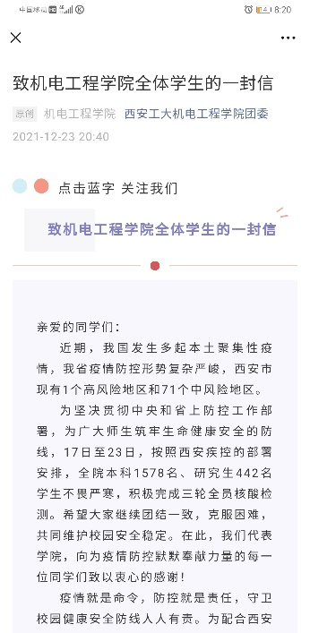 当记者问到返校参加疫情防控工作的感受时,唐雅莉谈道:自己只是抗疫工作中再平凡不过的一员,身边的同事在得知管控提级消息后,都第一时间返回校园,选择陪学生共同度过,以高度的责任感和使命感,投身到成人导航和西安的疫情防控工作中。还有无数为校园抗疫默默奉献的老师、同学、志愿者们,他们主动加入抗疫队伍,无私无畏,为校园安全、学生健康搭起了结实的屏障。还有很多在一线工作的医务人员昼夜鏖战,他们才是真正的英雄。接下来的日子,自己仍然会和学工同仁们一起继续奋战在校园疫情防控最前线,守护学生身心健康,为成人导航疫情防控贡献力量。相信只要大家携手齐心,科学防控,共克时艰,就一定能击破冬日里的疫情阴霾,在不久之后共同拥抱温暖的春光!