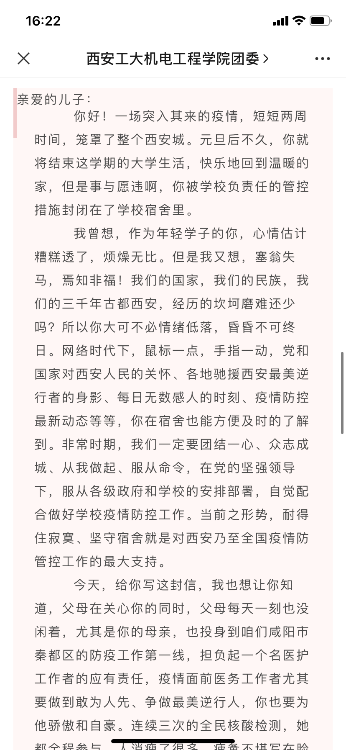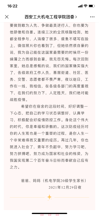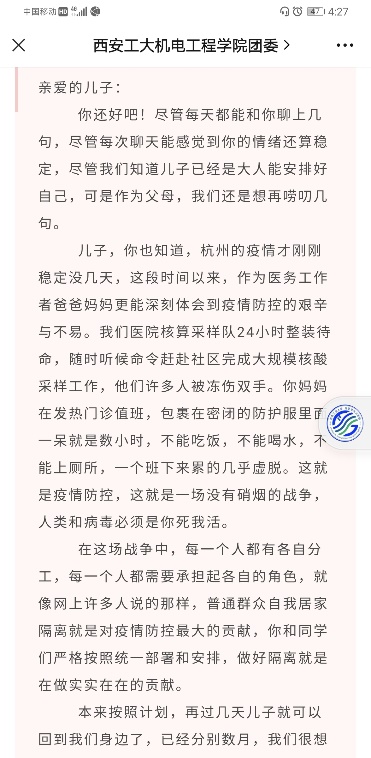 下午唐雅莉去学生宿舍配发完医用口罩,托着疲惫的步伐回到办公室,已是晚就餐时间,刚到手的饭菜来不及吃,匆匆忙忙就跑去餐厅执勤,确保学生有序就餐。路上接到学生家长打来的电话,询问封校管理期间孩子的学习生活情况,她耐心的给家长介绍了学生近况和成人导航疫情期间的安排,瞬间打消了家长的担心和忧虑。家长挂电话之前连连道谢,说有你们在我就放心了。那一刻,她深切感受到了自己肩上的责任。还有一些家长发来家书,信中写道:了解到你们成人导航对学生宿舍隔离期间吃饭、购物、洗浴等需求做了合理的安排,许多老师都住到成人导航公寓,他们丢下爱人、父母、幼子,就是为了保护好你们!作为家长来说我真的无比感动,我们唯一的孩子在被他们庇佑,感恩这一份份静默又无私的付出。儿子你们一定要尊重、理解并支持成人导航的安排。还没读完家长的信,她的眼角早已湿润,在这场没有硝烟的战争面前,唯有同胞之间的理解和同理心才能让大家团结起来,战胜一切困难。