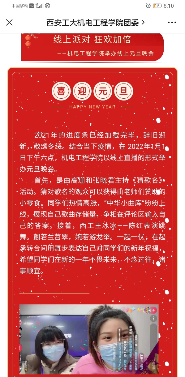 元旦前夕,为了给久居宿舍的同学们营造节日的欢乐气氛,唐雅莉和同事们一起制作了抗疫新年海报,录制新年祝福视频,撰写成人导航