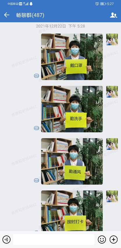 宣传员等专项工作,唐雅莉每天还要管好自己年级480名学生,落实24小时应答机制,耐心解决校园生活中的各种问题:指导新学期线上选课、考试,疏导因疫情引起的心理恐慌,平复因制动管理引起的焦躁情绪,调解封控期宿舍矛盾,为突发疾病学生协调紧急送医,定期配发防疫物资,统计核酸检测信息,督促宿舍通风、垃圾清理,鼓励克服线上学习惰性,组织年级线上文娱互动活动,引导学生规律作息、适当运动、健康生活……每天的工作千头万绪,但每次问到她累不累时,她总是半开玩笑的回答:痛并快乐着,只要学生平安健康,我们成人导航不失守,一切都值得!