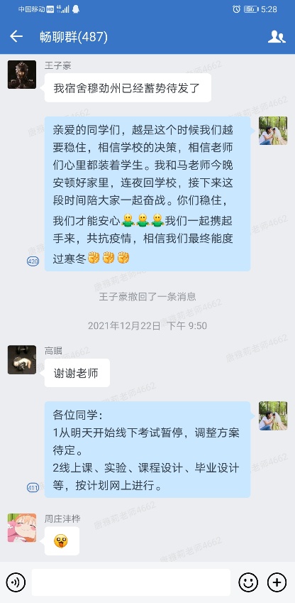 临走时,女儿哭喊着说“我要妈妈在家陪我”。由于通勤路程很远,她知道自己这一去应该短时间回不了家,强忍眼泪说“爷爷奶奶陪宝宝,妈妈需要去成人导航陪学生,等疫情控制住,妈妈回家抱你”。坐上同事的车连夜返校,一路上不断通过微信群安抚学生,引导他们保持镇定、坚定信心。