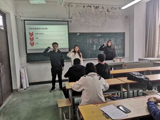 大会首先由支部书记高珊发表讲话。高老师首先指出了大家在党支部规模不断壮大的同时应更加注重保持党员的先进性,时刻严格要求自己。同时,高珊希望本次的发展对象能够端正入党动机,做好接受党组织考验的准备。随后,2名发展对象杨英和任栋栋依次上台讲述了自己的入党动机、入党历程和对党的理解和认识,同时结合自己的实际情况表达了自己加入中国共产党的决心和强烈愿望。在发展对象讲述完毕之后,作为入党介绍人的正式党员和群众代表发表了对发展对象的意见。在最终的投票表决阶段,各发展对象都顺利通过了现场正式党员半数以上的投票。然后支部预备党员表明决心坚决服从组织,继续努力,全心全意为人民服务。