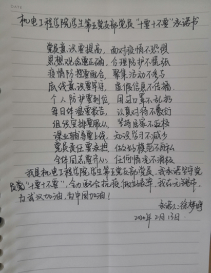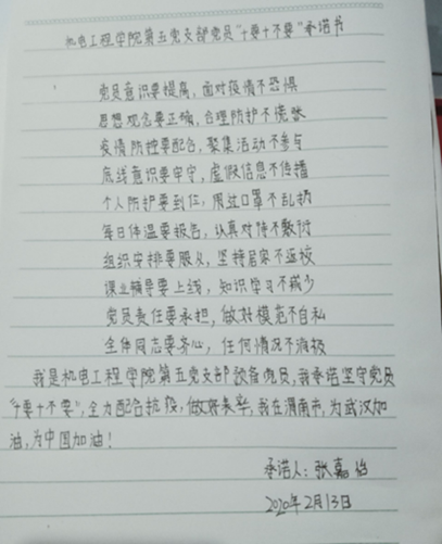 学生第五党支部防范疫情“十要十不要”承诺书。全体党员手写承诺书并签字。