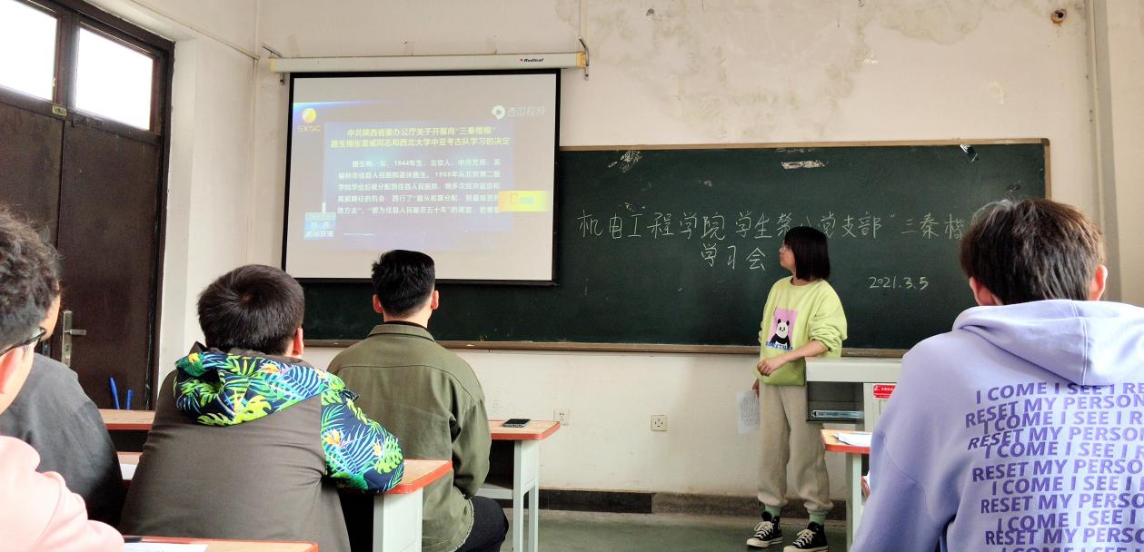党总支学生第八党支部于2021年3月5日上午在工二-401教室开展“三秦楷模学习会”主题党日活动。参加会议的有支部书记张晓君同志及支部全体党员。