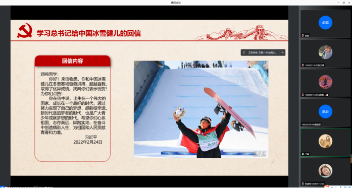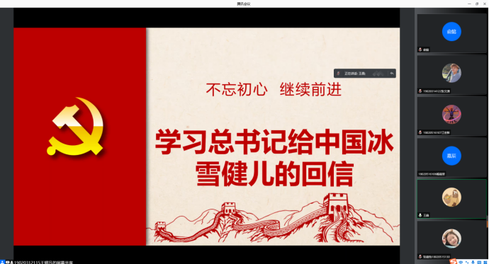 学生第五党支部线上开展学习《习近平总书记给中国冰雪健儿的回信》活动。支部组织委员王熠凡主持本次活动,全体支部同志参加。