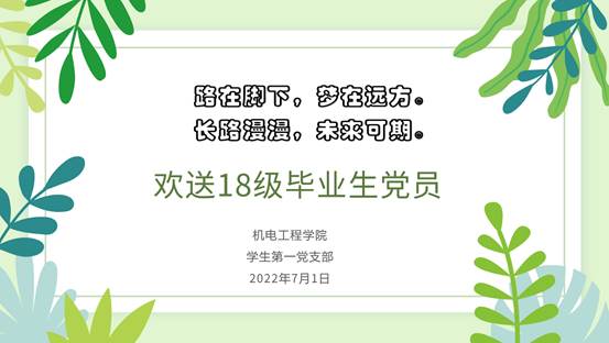 学生第一党支部开展以“路在脚下,梦在远方;长路漫漫,未来可期”为主题的会议,欢送18级毕业生党员,会议由支部书记张岩主持,全体党员参会。