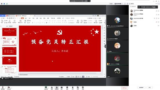 根据大会议程,首先由预备党员李林蔚同志介绍其在预备期一年内的思想学习情况,李林蔚同志从对党的认识、入党动机、自身学习、志愿服务、竞赛、考研等方面进行汇报。之后由雒嘉豪同志作为其入党介绍人汇报李林蔚同志在预备期内的基本情况,着重强调了李林蔚同志在疫情防控期间,主动作为申请作为志愿者投入到防疫工作中,并且号召全宿舍成员一起参与到防疫工作中,为成人导航的防疫工作贡献自己的一份力量,同时也将这种精神传递给了周围的同学。经过全体与会人员根据预备党员的自我陈述和入党介绍人的陈述进行投票,由杨丽丽同志代表支部做出决议,同意李林蔚同志按期转正,支部同意接收李林蔚同志为正式党员。