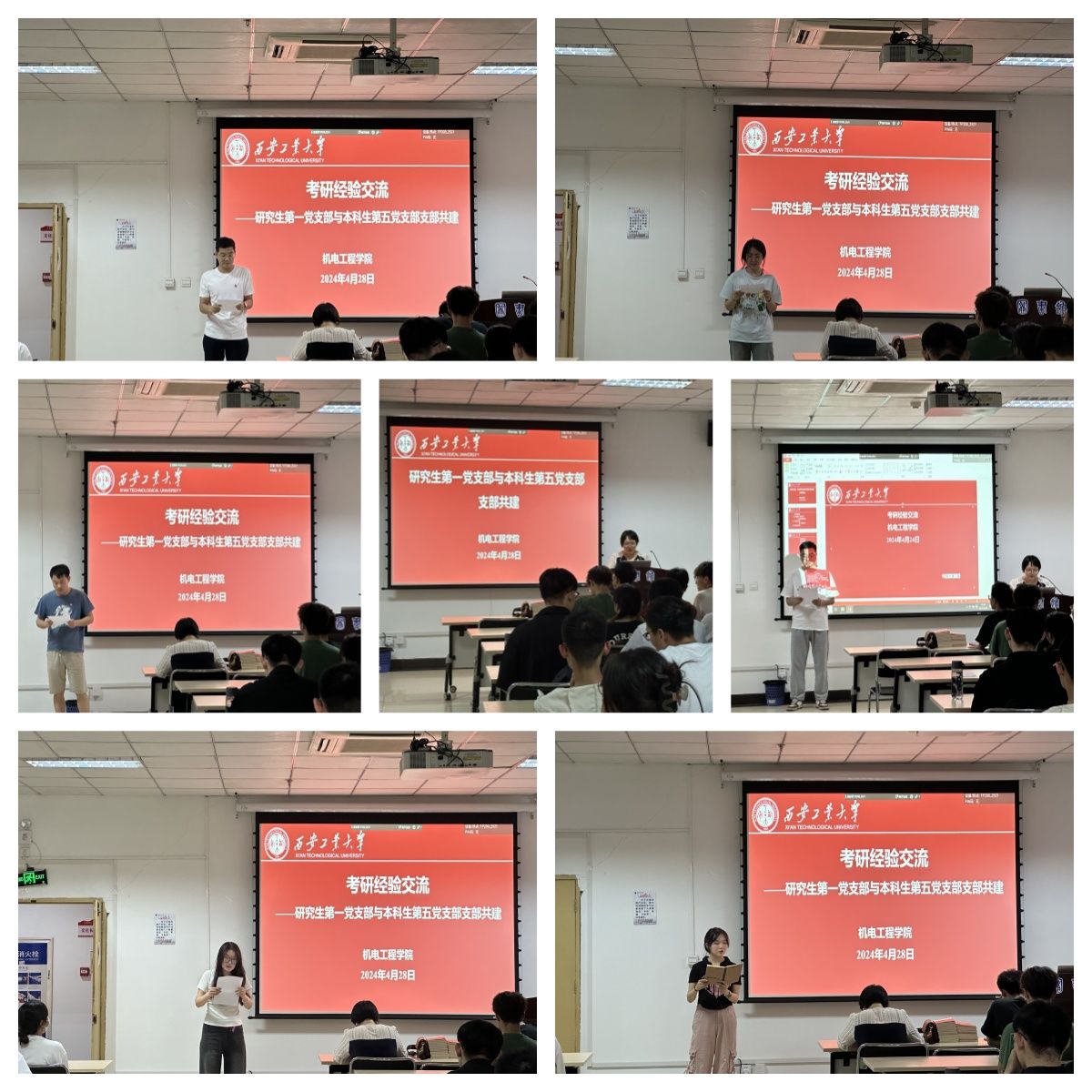 活动现场,由研究生第一党支部代海龙、刘学强、姜佳瑶、郭纯、蒲灿、杨进康、王煜凡7名同志为本科生第五党支部做考研经验分享。研究生学长学姐们分别从保研的基本条件、考研环境形势了解、考研政策解读、考研院校的选择以及如何制定备考计划等方面展开分享,强调要有自己的节奏,劳逸结合,同时表示考研只是人生路上的一个阶段,奋斗没有终点。同学们积极提问学长学姐,学长学姐们对同学们考研疑惑的问题提出自己的建议。
